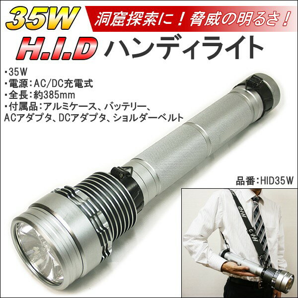 ● 商品説明内容■35W■電源:AC/DC充電式■全長:約385mm■重さ:約1.2kg(バッテリーを入れた状態) ■明るさ:3000lm■付属品:専用アルミケース、ACアダプタ、DCアダプタ、バッテリー、ストラップ■バッテリーにはLEDライトがついており、暗闇でのバッテリー交換も可能、非常用ライトとしても使えます。